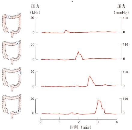 · 传输性收缩——包括起自升结肠向乙状结肠移动的高幅传输性收缩(high-amplitude propagated contractions,HAPC),这一作用将粪便移向直肠。粪块在一个地方保留较长一段时间后,当这收缩一出现,粪块粪块突然迅速地向前移动一小段距离(HAPC的定义:幅度在80mmHg以上,时程大于10秒,传输距离至少30cm)。