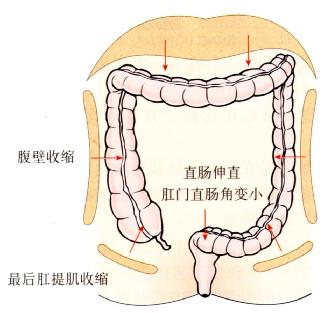 耻骨直肠肌松弛,促使肛门直肠角增宽(正常60~105度,增加到140度),形成无阻力肛门通道,促进排便(图5.7和5.8)。