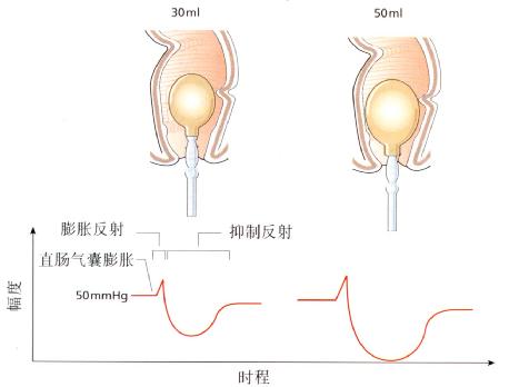 扩张试验为功能评估的简单试验。将可充水气囊插入直肠,正常人可以毫无困难地耐受150ml气囊容积。