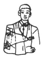 4.前臂骨折固定:用两块木板,一块放前臂上,另一块放背面,但其长度要超过肘关节,然后用布带或三角巾捆绑托起(图28)。