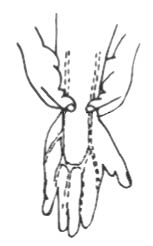 6.手部出血:互救时两手拇指分别压迫手胸襟横纹稍上处,内外侧(尺、桡动脉)各有一搏动点(图12)