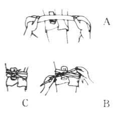 1.橡皮止血带止血法:在肢体的恰当部位如股部的中下1/3、上臂的中下1/3,用纱布、棉布或毛巾、衣服等物作为衬垫后再上止血带。用左手的拇指、食指、中摾持止血带的头端,将长的尾端绕肢体一圈后压住头端,再绕肢体一圈,然后用左手食指、中指夹住尾端后,将尾端从止血带下拉过,由另一缘牵出,系成一个活结(图18)。