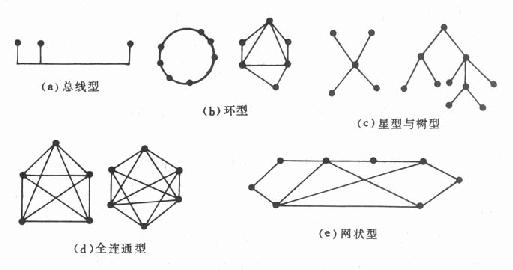 (5)网状型。如图18-2(e)。这是最一般化的网状结构,连接各节点的物理信道呈不规则的形状。具有较高的可靠性,而且资源的共享也比较方便。