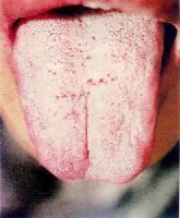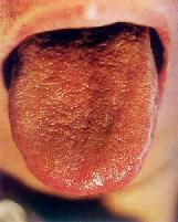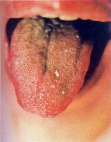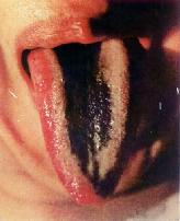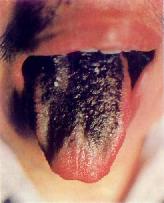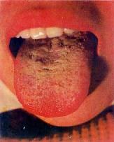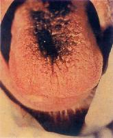 ③灰黑苔 多主热证,亦有寒湿或虚寒证。舌苔灰黑而干,为热盛伤津;舌苔灰黑而湿润,多属阳虚寒盛。灰黑苔多见于疾病比较严重的阶段。