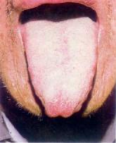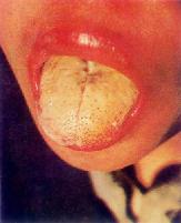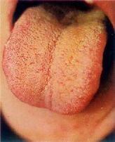 (3)润燥:反映体内津液的情况。正常舌苔不干不湿,无苔干燥为体内津液已耗,外感病多为燥热伤津,内伤病多为阴虚津液不足;舌苔湿润表明津液未伤,而苔面水份过多伸舌欲下滴,称为滑苔,则示体内有湿停留。