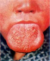 舌象:舌质淡红、苍老、白苔满布、微黄、粗糙如砂石。