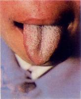 ③芒刺:舌乳头增生、肥大,突起如刺,多属热邪亢盛。热邪越重,芒刺越大、越多。临床上芒刺多见于舌尖与舌边,舌尖芒刺多属肝胆热盛。