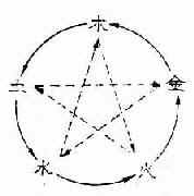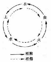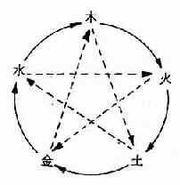 3.五行制化:在五行相生之中,同时寓有相克,在相克之中,同时也寓有相生。这是自然界运动变化的一般规律。如果只有相生而无相克,就不能保持正常的平衡发展;有相克而无相生,则万物不会有生化。所以相生,相克是一切事物维持相对平衡的两个不可缺少的条件。只有在相互作用,相互协调的基础上,才能促进事物的生化不息。例如,木能克土,但土却能生金制木。因此,在这种情况下,土虽被克,但并不会发生偏衰。其它火、土、金、水都是如此。古人把五行相生寓有相克和五行相克寓有相生的这种内在联系,名之曰“五行制化”。制化规律的具体情况如下: