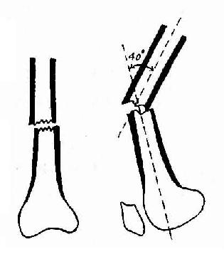复位时应注意对位及对线,对位指两断端接触面多少而言,例如4/5对位,90%对位等;对线系指两骨块的轴线所形成的角度而言,例如成角40o(图2-41及图2-42)。