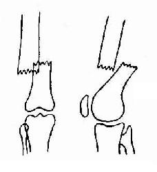 图2-41 股骨下1/3横行骨折,远段向上后内移位,