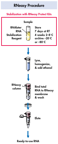 和传统的RNeasy Kit一样,RNeasy Protect Kits采用QIAGEN著名的硅胶膜纯化柱技术,迅速特异地吸附样品裂解液中的RNA,无需酚氯仿抽提,不用乙醇沉淀或LiCl沉淀,也不用CsCl超离,只要洗脱即可得到纯的RNA。通常情况下RNeasy的纯化技术足以除去绝大部分的DNA,而无需额外进行DNaes处理,但是对于一些对痕量DNA非常敏感的实验,用RNase-Free DNase Set(QIAGEN cat.no. 79254)可以直接在纯化柱上消化DNA残留,在随后的洗涤步骤中除去DNase,最后洗脱得到不含DNA的纯RNA。
