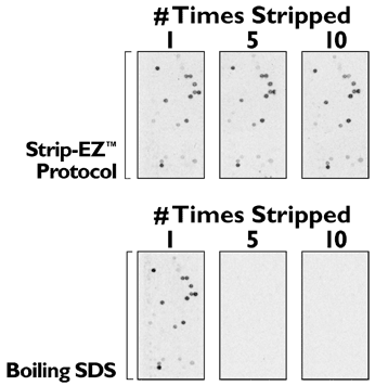 Ambion公司的Strip-EZ RT Kit是专门为尼龙膜基质的Macroarray,以及各种预制杂交膜而设计的cDNA探针合成标记试剂盒。我们在前面介绍过尼龙膜基质或者塑料基质的Macroarray的优点之一是在杂交检测后可以将膜上结合的探针洗脱,因而膜可以重复使用多次,能够一定程度的降低每一次的使用成本。常规的膜再生方法需将膜放在SDS溶液中煮沸一定时间,因而会对膜和膜上的信号造成损耗,通常重复使用3次后已经得不到清晰的信号。
