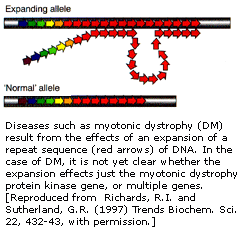 肌肉细胞本身缺陷所造成的二种原发性疾病是杜兴(型)肌营养不良(DMD)和肌强直营养不良(DM),DM是另一种“动力突变”疾病。亨廷登舞蹈病也同样如此,它与肌肉蛋白质激酶基因发生突变造成核甘酸酶重复扩展有关。DMD与缺乏对维持细胞结构起重要作用的细胞支架蛋白、肌细胞增强蛋白有关。