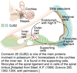 Cx26突变引起先天性综合症,非综合症的耳聋不会伴有如视觉缺损这类的症状。Cx26被定位于染色体13q11-12并编码称为连结蛋白26的间隙结合蛋白,间隙结合蛋白是原生质膜通道,它让小分子和离子在毗邻细胞之间运动。内耳的间隙结合蛋`白可能起保持钾离子体内平衡的作用,它对内耳的功能和听力是重要的。已认识到Cx26的突变可能破坏钾离子循环,因而出现耳聋。