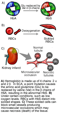 大约8%非洲后裔美籍人是携带者。HBB的突变导致产生结构不正常的Hbs血红蛋白(Hb),Hb是一种产生血蛋白的携氧蛋白,具带色特点。在某些如低氧或高浓度血红蛋白的条件下,具有Hbs血红蛋白的患者,其不正常的Hbs簇聚集,把受扰乱的RBCs变成镰刀形,改形并固定下来,结果就产生疼痛甚至形成危害性组织。