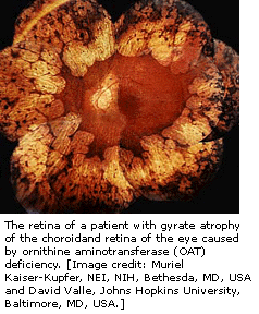 在染色体10上,找到引起螺旋状萎缩的基因突变,编码一种称为鸟氨酸酮酸转氨酶(OAT)。不同的OAT遗传突变引起疾病症状的严重性不同。OAT把氨基酸鸟氨酸从尿环形式最后转化成谷氨酸盐。在螺旋状萎缩中,由于缺乏OAT功能,就增加了鸟氨酸的等离子水平。