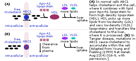 TD是由9q31染色体上ABC1(束缚ATP的盒)的基因突变所致,ABC1编码一种帮助细胞摆脱过量胆固醇的蛋白质,由血中的HDL微粒接纳过量的胆固醇并把它携带至肝脏,经肝脏加工胆固醇被整个身体细胞备用,患有TD病的个体不能从细胞中消除胆固醇,导致在扁桃体和起它器官中类积。这一重要的胆固醇输送基因的发现可以导致掌握HDL水平及在美国与主要危险冠状动脉病之间的相反关系。开发调节HDL水平的新药不仅帮助患TD的病人而且能帮助更多有HDL缺陷家属史的病人。