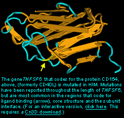 在对一种新抗原正常应答中,B细胞首先产生lgM抗体,随后B细胞打开产生lgG,lgA和lgE.就能产生更有效的保护组织和粘膜表面的抗体。来自HIM的最普遍现象是存在基因TNFSF5缺陷,TNFSF5基因在q26的染色体X上被发现。正常状态下,基因产生一种CD40的抗原配位子(CD154),一种在T细胞上对B细胞和其它免疫细胞上起到保证受体CD40作用的蛋白质。没有CD154,B细胞就不能接受从T细胞来的信号,就不能打开抗体产生lgA和lgG.免疫细胞之间缺乏CD40信号使得对HIM敏感的个体易受到如肺囊虫和隐孢子类的感染。