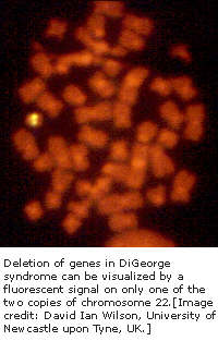迪乔治综合症是减数分裂(制造胚胎细胞和确认后代遗传差异的过程)重组发生差错,造成第22号染色体大量缺损所致。缺损意味着患有迪乔治综合症的病人在该区域中有几种基因不存在。出现疾病临床差异是与在染色体缺损中大量损失遗传物质有关。