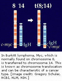 伯基特淋巴癌起因于包括MYC基因在内的染色体易位。一种染色体易位意味着染色体受到破坏,易位至其它染色体上,在伯基特淋巴癌上经典的染色体易位发生在第8条染色体上,它是MYC基因的位置,因改变MYC的表达途径,因此在控制细胞生长和增殖中破坏常规功能。