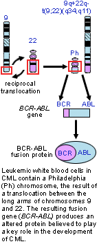 通过找到一种叫做PH染色体的不正常特殊染色体来常规诊断CML.PH,全称为philadelphia,是一个城市名,因首先在该城发现不正常染色体而命名的PH染色体。PH染色体是在长臂染色体9号和22号之间发生基因易位或基因交换的结果。交换带动两个基因一起交换:在染色22上的BCR(破碎点簇区),9号染色体上的原致癌基因ABC(Ahlesoon白血病毒),产生具有酪氨酸氨基转移激酶活性融合蛋白杂交基因BCR-ABC编码,它激活信号传导途径导致失控的细胞生长。