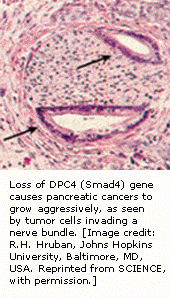 大约90%胰腺癌患者失去一部分染色体18,在1996年,从死于胰腺癌病人身上发现了肿瘤表达基因DPC4(smad4)所以DPC4可能在胰腺癌中起到作用,在脊椎动物存在smad蛋白质的全部家系中,包含设计途径的转化生长因素——Beta(TGT-Beta)的信号传导,另一种表达基因是P53和Rb,如果发生突变或缺乏基因组,就能引起各种组织的癌细胞生长。