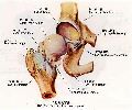 由股骨头与髋臼相对构成,属于杵臼关节。髋臼内仅月状面被覆关节软骨,髋臼窝内充满脂肪,可随关节内压的增减而被挤出或吸入,以维持关节内压的平衡。在髋臼切迹上有髋臼横韧带,并与切迹围成一孔,有神经、血管等通过。关节囊厚而坚韧,下端前面附于转子间线,后面附于转子间嵴的内侧。所以股骨颈骨折时,根据其骨折部位而有囊内、囊外或混合性骨折之分。髋关节周围有韧带加强,主要是前面的髂股韧带,下部有耻骨囊韧带,关节囊后部有坐骨囊韧带。关节囊纤维层环绕股骨颈的中部,称为轮匝带。髋关节为多轴性关节,能作屈伸、收展、旋转及环转运动。
