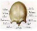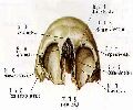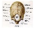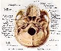 后部中央可见到枕骨大孔及其两侧的枕骨髁,枕骨髁后方有不恒定的髁孔,前方有舌下神经管外口。枕骨大孔前方正中有咽结节,两侧有颈静脉孔和颈静脉窝。颈静脉窝的前方有颈动脉管外口,再向内侧可见破裂孔,颈静脉窝的前外侧生有茎突,其后茎乳孔,孔的后方为乳突。外耳道在茎突前外侧,其前方有下颌窝和下颌结节,在枕骨大孔后方有枕外嵴、枕外隆凸及其两侧的上项线和与之平行的下项线。