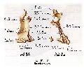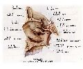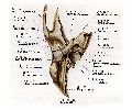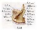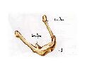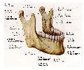 下颌骨mandible位于上颌骨下方,分体和支。体呈弓状,下缘光滑,上缘生有下牙槽。外面前方正中部向前的隆起叫颏隆凸,对第三颗牙槽下方处有颏孔。在体的内面中线处有尖锐的颏棘,其下方两侧有二腹肌窝,由窝的上缘一条斜线,叫下颌舌骨线,线的内上方和外下方各有一浅窝,上方为舌下腺窝,外下方为下颌下腺窝。下颌支末端分叉形成前方的冠突,后方的髁突,中间凹陷处叫下颌切迹,髁突上端膨大,叫下颌头,其下稍细,叫下颌颈,颈的前面有翼肌凹。在支的内面中央有下颌孔,经下颌管通向颏孔,在下颌孔前方有下颌小舌。支与体的接合部叫做下颌角,角的外面有咬肌粗隆,内面有翼肌粗隆。