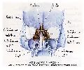 蝶骨位于颅底中央,形如蝴蝶,分体、小翼、大翼和翼突四个部分。体部位居中央,上面构成颅中窝的中央部,呈马鞍状叫蝶鞍,中央凹陷叫垂体窝;体部内有空腔叫蝶窦,向前开口于鼻腔。小翼从体部前上方向左右平伸,根部有视神经管,两视神经管内口之间有视交叉沟。大翼由体部平伸向两侧,可分三个面:脑面位于颅中窝,眶面朝向眶,颞面向外向下。大翼根部由前向后可见圆孔,卵圆孔和棘孔。体部两侧有颈动脉沟。在小翼和大翼之间有眶上裂。翼突位于蝶骨下面,由内侧板和外侧板构成,两板的后部之间有楔形深窝叫翼突窝,翼突根部有前后方向贯穿的翼管。