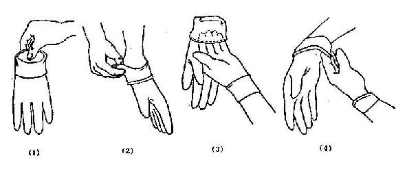 2.脱手套 将手套口翻转脱下,不可用力强拉手套边缘或手指部分。