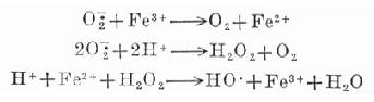 上面提到缺血组织中,过氧化游离基含量过多,通过它的促发作用,引起铁离子催化的Haber-Weiss反应,产生反应力极强的氢氧基。