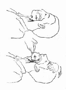 1.病人体位 病人平卧在平地或硬板上。应注意有无外伤,有外伤时,如骨折,搬动病人时,应注意不要加重伤情。立即保持气道通畅,使用仰头-抬颏法,使病人的口腔轴与咽喉轴约成直线,既可防止舌根、会厌阻塞气道口,又方便气管插管(图6-3)。操作者一般站在病人右侧,用左手置於病人前额上,用力向后压,同时右手手指放在病人下颌骨下缘,将颏部向上、前抬起,这样就完成了仰头-抬颏法,就可以保持气道通畅。