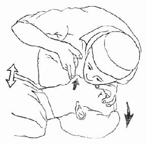 实际上把C和B的次序对换一下,可能更符合实际情况。因为当心脏骤停后,肺泡内尚有适量空气,所以似乎应该先按胸骨4~5次,立即维持大脑组织所需血液,然后再口对口呼气1~2次。这更符合实际情况。CPR手法如下。