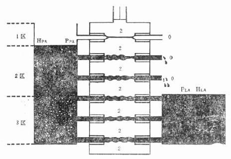 人直立时,自肺尖至肺底有一定距离,成人约为30cm,肺血流分布可以想像为上述模型的扩展,由一系列平行可压缩毛细血管组成,均处于相同的肺泡压Palv作用之下,Palv约为0.0196kPa(2cmH2O),地心引力对肺动脉和肺血流分布的影响可由图3-10解释。肺动脉压PPA由流入贮池代表,经常充满至较肺最低部位的动脉高23cm处高度。流出贮池中液体的高度保持较肺最低部位静脉高11cm水平。当流出压力超过11cm时(相当左房压,以PLA表示)方有血液溢流。据此模型,流经每条毛细血管血流量就由灌注压决定,也就是由血管的高度决定。于模型的最上部,相当肺尖部,一般称为1区,Palv为0.0196kPa(2cmH2O)已超过Ppa血管被压,无血流通过。在肺的2区,即模型的中央部,Ppa>Palv>PLA。此区有血流经过,而每条血管中血流量由流入压和肺泡压差(Ppa-Palv)决定,因此血管的高度影响血流量,在此区中靠上方的血流量小于下方者。模型的最下部(3区),每条血管Ppa均超过Palv,但流出压PLA>Palv,所以此区血流量由Ppa-PLA决定,肺动脉与肺静脉在不同高度所增加的压力均相等,每条血管中血流量均相仿。不像2区受引力影响。