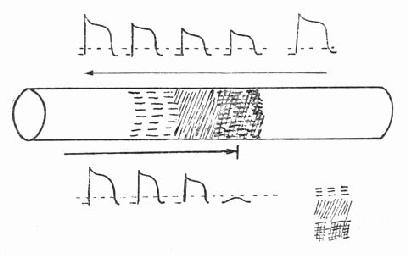 1.存在着递减性传导区 心肌的一部分存在着轻重不等的受损区,在激动由左向右进行时,借助于由正常心肌传来的较强的除极力量,它可以通过有障碍的区域,虽然它的势能减弱,传导速减缓了。当激动由右向左前进时,由于已受到前一段有传导障碍的心肌的影响,传导力量已趋减弱,最后则终止在有较重的传导障碍区(图2-14)。