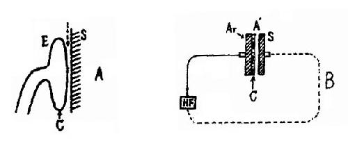 虚线-电力线回路,A治疗时情形;B-等效电路;