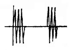 3.脉冲正弦电流:正弦电流以脉冲形式出现,通电时间短,脉冲峰值大,断时间长,如图5.1.4,目前采用这种电流的有脉冲短波和脉冲超短波疗法。最近出现脉冲微波实验研究报导,但临床应用尚少见。
