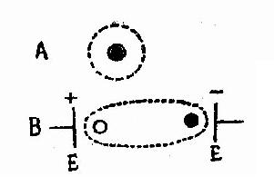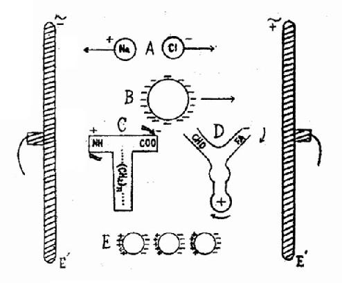 E'-电极;-+高频电的瞬间极性;A-简单离子;B-带电胶体