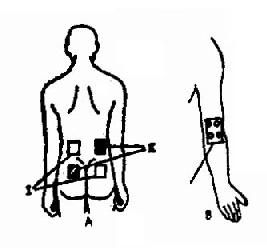 图4.2.6 固定法应用示例 A-用一般电极治疗腰痛 B-用一个四联电极治疗肘关节伸侧疾病 |