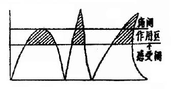(一)半波正弦电流和其他一些电流的比较 因为生理作用仅在感受阈与痛阈之间的作用区内的电流才能引起,从图3.2.2可以看出,在波宽和峰值相近的情况下,半波正弦电流的作用区较感应电流和指数曲线型电流均大,苦要使后两种电流的作用区与前者相近,则后者的峰值均将超出痛阈而引起痛感。(图3.3.3)。