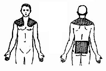 6. 领区反射治疗法:一个1000cm2披肩式电极置于领区,另一电极400cm2置于腰骶部(图2.2.10)。从6mA,6分钟开始,每隔一日增加2mA,2分钟,至16mA,16分钟为止。每日一次,12~16次为一疗程。