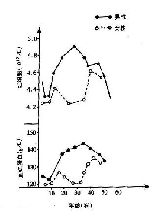 (1)年龄与性别的差异:初生儿由于在母体内以弥漫方式从母体血液获得氧气,通常处于生理性缺氧状态,故红细胞明显增高,但在出生2周后就逐渐下降。男性儿童在6-7岁时最低,随着年龄增大而逐渐上升,到25-30岁时达高峰,30岁后随年龄的逐渐下降,直到60岁时尚未停止。在女性儿童也随年龄增大逐渐增长,到13-15岁时达最高值,而后帽于月经、内分泌等因素影响逐渐下降,到21-35岁维持最低水平后又逐渐升高与男性水平相近(图2-1)