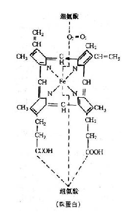 血红蛋白是在人体有核红细胞及网织红细胞内匐成的一种含色素辅基的结合蛋白质。色素部分是亚铁血红素,蛋白质部分是珠蛋折,血红素是由原卟啉和铁原子组成的一种结合物,亚铁原子的六个配位键中的四个与原卟啉的四个吡咯坏的氮原子相边,一个与珠蛋白的肽链F肽段第八个氨基酸------组氨酸的咪唑基相边,另一个键则可逆性地与氧结合,完成运氧功能。当各种原困使Fe2+氧化成Fe3+即丧失携氧功能。与一切蛋白质结构一样,Hb的珠蛋白部分是由两条α链(α链及胚胎时的ξ链)和两条非α链(β链、γ链、δ链及胚胎时的ε链)组成。α链由141个氨基酸组成,β链由146个氨基酸组成。两对肽链聚合成四聚体、即Hb分子,亚铁血红素结构见图2-2。