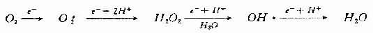 这是其他活性氧产生的基础。过氧化氢(H2O2)及羟自由基(OH·)续发于此。即氧在获得一个电子时还原生成O2-,获得2个电子生成H2O2,获得3个电子生成OH·,获得四个电子生成H2O。