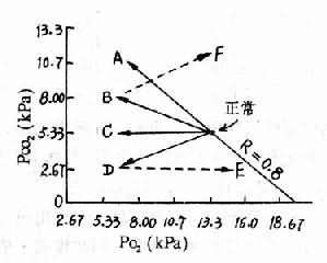图13-4 呼吸衰竭时不同类型的血气变化A. PaO2↓PaCO2↑,二者变动值呈一定比例B. PaO2↓PaCO2↑,二者变动值不呈一定比例C.PaO2↓PaCO2,不变E. D用氧后D.PaO2↓PaCO2明显降低 F. B用氧后