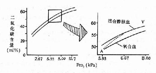 在慢性Ⅱ型呼吸衰竭病人,随着低氧血症和高碳酸血症发展的逐渐严重,其呼吸调节也将发生变化:此类病人的中枢化学感受器常被抑制而对二氧化碳的敏感性降低,此时引起通气的冲动大部来自缺氧对外周化学感受器的剌激。如果给予高浓度的氧吸入,则虽可缓解低氧血症,但却因此解除了缺氧反射性兴奋呼吸中枢的作用,故易招致呼吸进一步的抑制,使通气更减弱而二氧化碳的潴留更加重。此外,吸入高浓度氧使血氧饱和度回升后,由于霍尔登(Haldane)效应使二氧化碳解离曲线向右下移动(图13-5),也可引起Paco2进一步增高。