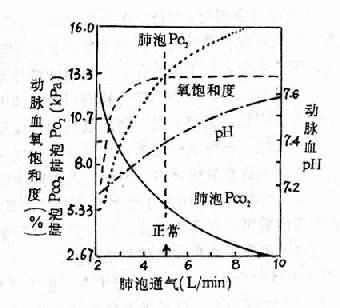 肺顺应性降低引起的限制性通气障碍的患者,呼吸常加快,总通气量可增加。同时因其病变常不是均匀一致的,还有肺泡通气血流比例失调,故体内二氧化碳可化偿性地排出增多,其血液气体变化亦常为Pao2下降,而Paco2不变或略低。