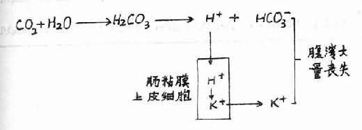 再如输尿管乙状结肠吻合术后,病人可发生酸中毒低血钾。消化液与体液等渗,含钾5~20mmol(mEq)/L,但在结肠下部有时可达30mmol(mEq)/L。结肠粘膜上皮细胞能分泌HCO3-和K+。用生理盐水做保留灌肠,证明结肠粘膜能吸收Na+、Cl-。经过一段时间抽出后,见抽出液中含多量K+、HCO3-。输尿管乙状结所吻合后,尿液排出乙状结肠,尿中H+可被吸收入血而引起酸中毒,且HCO3-排出增多,又能加重酸中毒。K+可因稀便而不断丧失,这就是此时酸中毒而伴以低血钾的原因。输尿管吻合于回肠则好得多。
