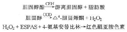 首先将血清中胆固醇酯在胆固醇酯酶(CEH)水解为游离胆固醇和脂肪酸,胆固醇在胆固醇氧化酶(COD)作用下,生成△4-胆甾烯酮和H2O2,再H2O2经过氧化物酶(POD)作用在4-氨基安替比林(4-AA-P)及N-乙基-N-(3-磺基醋酸)-3甲氧基苯胺(N-ethyl-N-(3-sulfopropyl)-manisidine,ESPAS)参与下,生成红色醌亚胺色素。